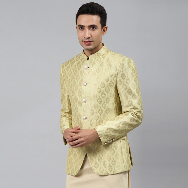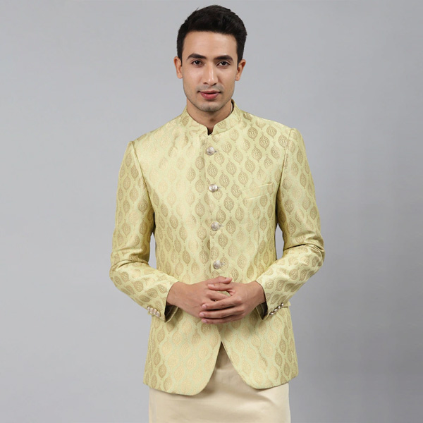 Men Gold Self-Design Slim Fit Bandhgala Blazer