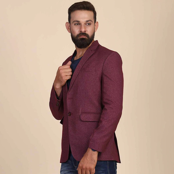 Maroom solid slim-fit blazer, has a notched lapel collar, full sleeves ,single-breasted with twod button closure, and two flap-pocket.